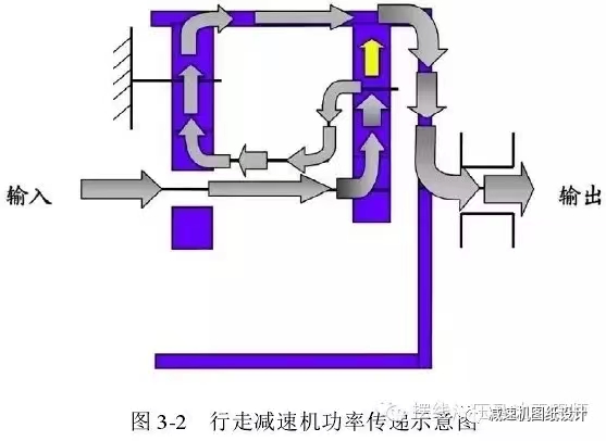 封閉差動行走減速機(jī)以功率分流再合流的方式實現(xiàn)功率傳遞過程。首先,功率在差動級被兩路分流至差動級的齒圈輸出,以及通過封閉級輪系以封閉級齒圈輸出,由于兩級的齒圈都與機(jī)匣相連,最終功率合流將整機(jī)功率傳輸?shù)酵饨勇膸ф溳喩蠈崿F(xiàn)了履帶行走功能。其功率流程圖如圖 3-2 所示。